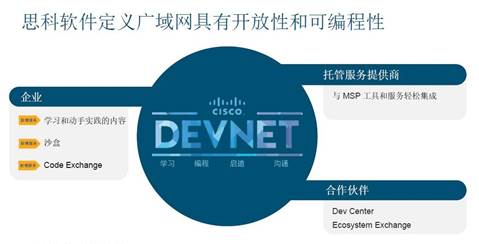 除了提供卓越的安全和應(yīng)用體驗外,思科SD-WAN還具備開放性與可編程性。曹圖強表示,“首先,思科將通過 DevNet 開發(fā)平臺向所有用戶開放API,為開發(fā)人員提供更大價值;其次,對合作伙伴而言,思科希望提供一個可交互的平臺幫助用戶進(jìn)行分享。任何用戶有特殊的需求,可以在DevNet 與大家分享。具體來說,在整個安全的廣域網(wǎng)部署中, IT人員可以通過開放的平臺,根據(jù)不同的環(huán)境和需求進(jìn)行二次開發(fā)。”