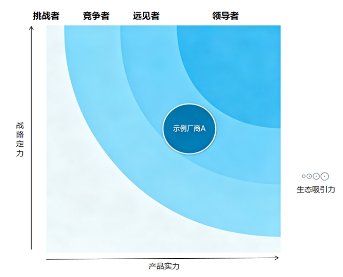 最終,我們不會簡單排出123名,而是繪制出"引力象限圖":X軸代表企業(yè)當前的產品實力,而Y軸則代表企業(yè)當前產品戰(zhàn)略,圓圈大小則代表生態(tài)吸引力。同時引力象限被劃分為四個區(qū)域——領航者、遠見者、競爭者、挑戰(zhàn)者。這種二維定位比線性排名更能反映企業(yè)的真實處境。