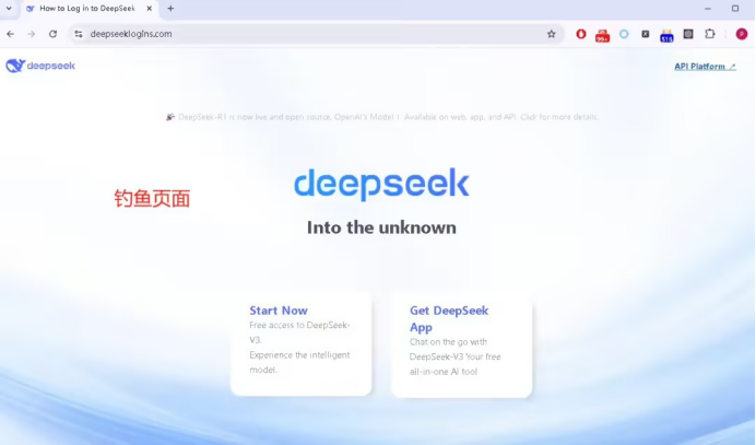 以釣魚網站“https://deepseeklogins.com/”為例,其頁面結構和風格與 DeepSeek 官方網站高度相似,旨在通過偽造官方頁面來誘導用戶泄露敏感信息。與真實網站相比,釣魚頁面移除了中英文切換的超鏈接。在該釣魚頁面中,點擊右上角的“API Platform”鏈接將會引導用戶跳轉到偽造的登錄頁面。