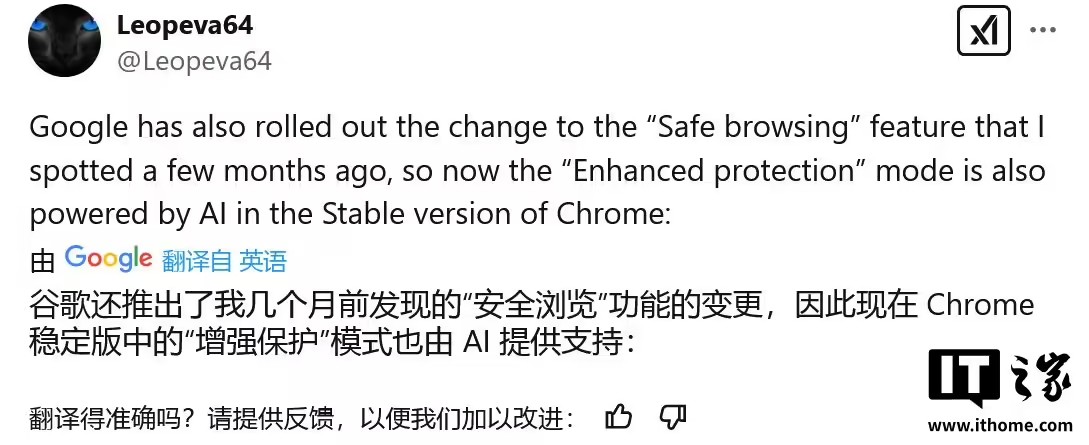IT之家 2 月 17 日消息,消息源 @Leopeva64 昨日(2 月 16 日)在 X 平臺(tái)發(fā)布推文,稱在經(jīng)過 3 個(gè)月的 Canary 頻道測(cè)試后,谷歌 Chrome 瀏覽器穩(wěn)定版已全平臺(tái)上線全新“增強(qiáng)保護(hù)”(Enhanced protection)功能,在現(xiàn)有功能基礎(chǔ)上,通過 AI 實(shí)時(shí)防護(hù)危險(xiǎn)網(wǎng)站、下載和擴(kuò)展程序等。